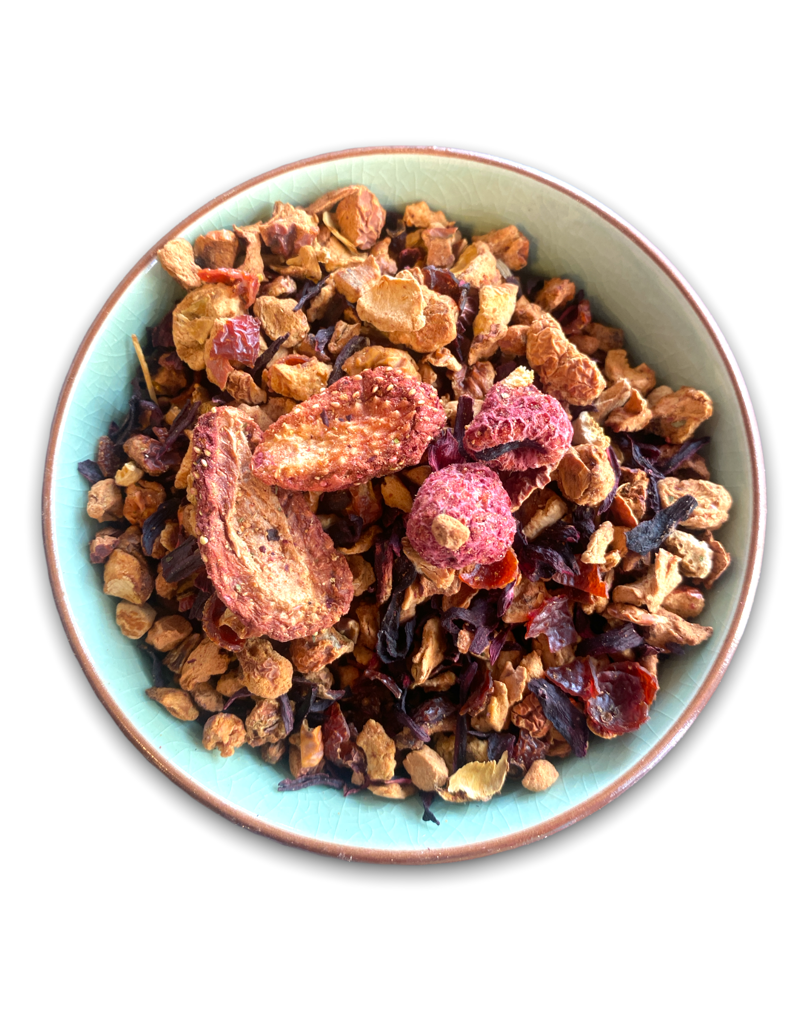 Apfel, Hibiskus, Hagebutte, Dattel (Dattel, Reismehl), Erdbeere, natürliches Erdbeer Aroma, Orangenschalen, natürliches Himbeer Aroma, Himbeere